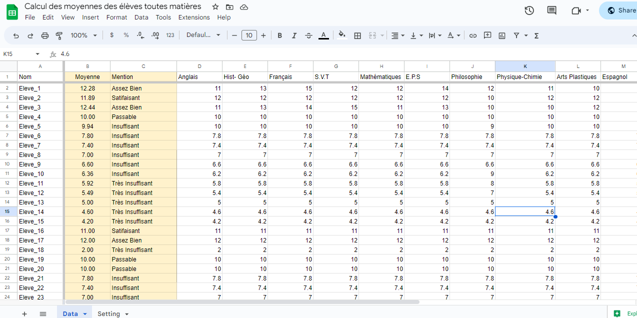 Avec ce tableur, vous pouvez facilement saisir les moyennes des matières de chaque élève et obtenir instantanément la moyenne générale de chaque élève pour chaque trimestre ou semestre.
