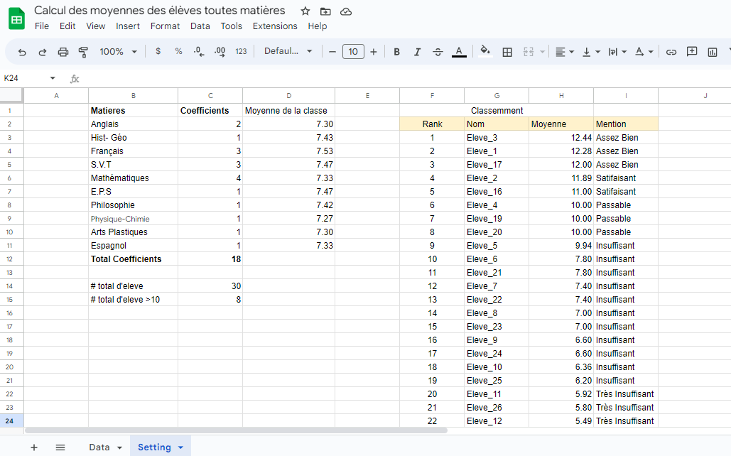 Le tableur est facile à utiliser et peut être partagé avec d’autres enseignants pour faciliter la collaboration. En outre, ce tableur calcule automatiquement le rang de chaque élève en fonction de sa moyenne pondérée.