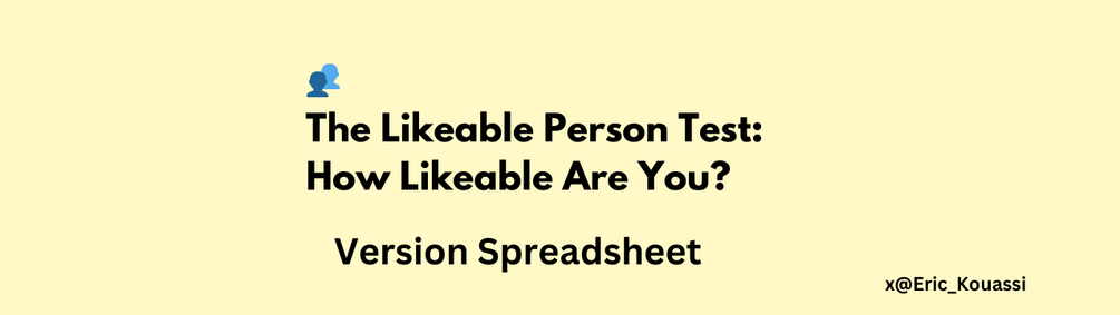 The Likeable Person Test: How Likeable Are You?$0+$0+https://schema.org/InStockusdEric KEric KFree spreadsheet tool to automate the scoringName a fair price:$I want this!Add to wishlist New wishlistShareShare on XShare on Facebook Copy linkCopy product URL
